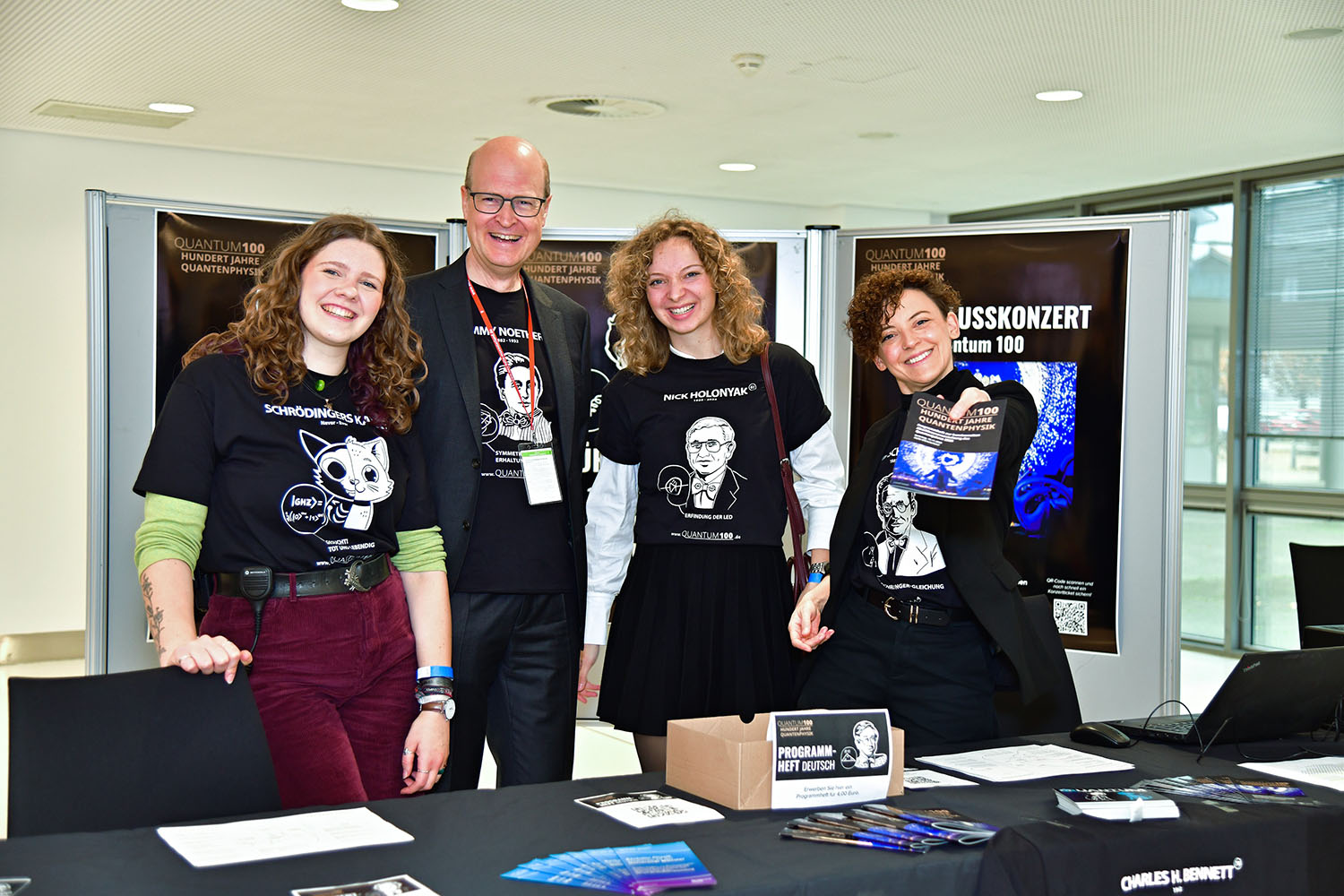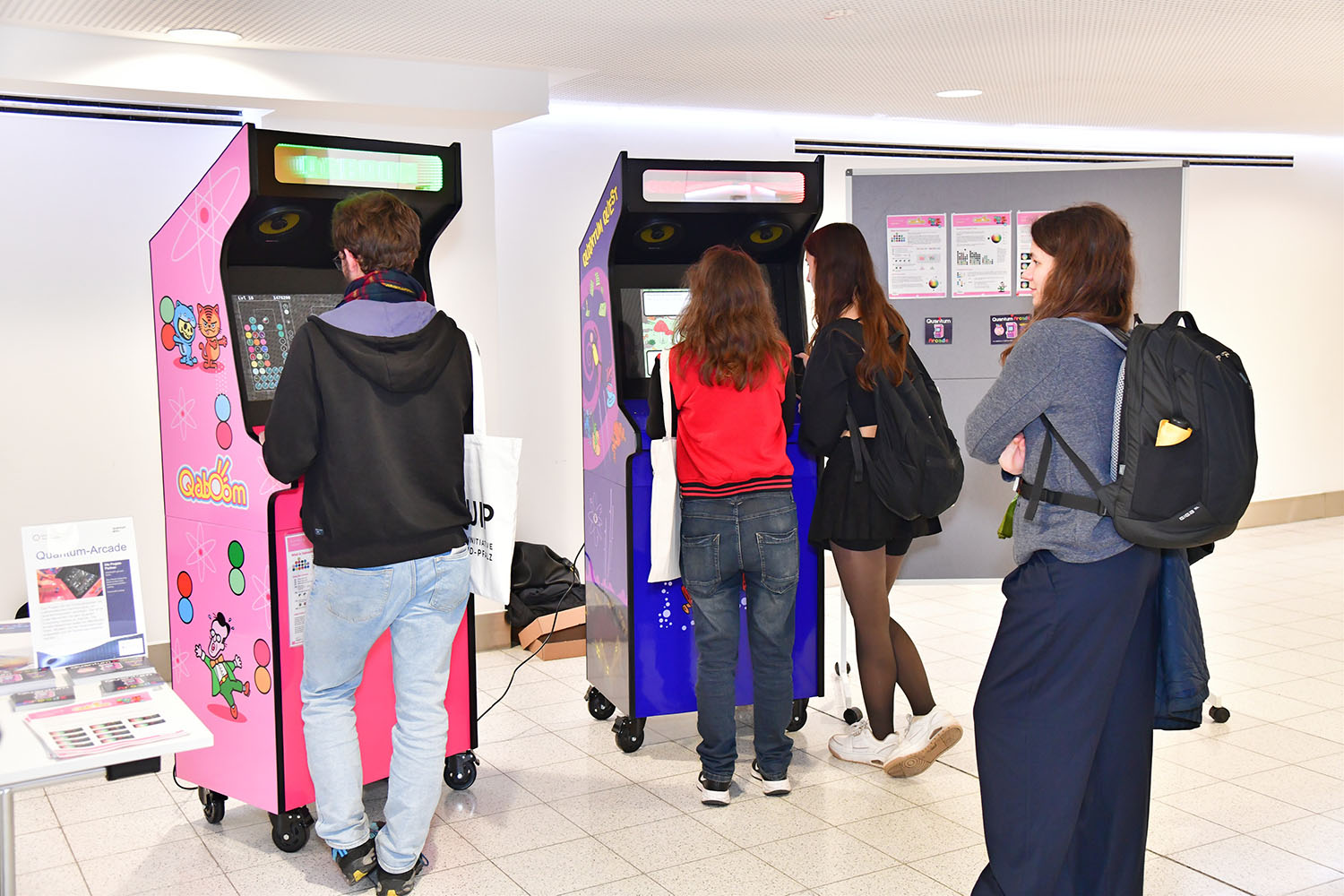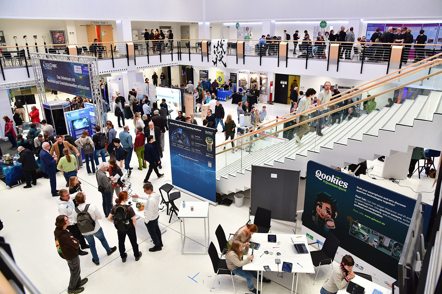 Vertreter*innen aus Bildung, Wissenschaft und Industrie präsentierten innovative Ideen und zeigten spannende technische Errungenschaften und Exponate aus 100 Jahren Forschung und Entwicklung im Bereich der Quantentechnologie. Parallel zur Ausstellung fanden allgemein verständliche Vorträge sowie Workshops für Schülerinnen und Schüler statt.